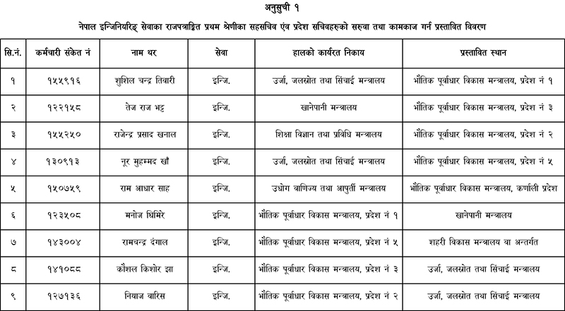 काठमाडौ – नेपाल सरकारको भदौ ४ गतेको मन्त्रीपरिषद्को निर्णय अनुसार प्रदेश तथा प्रदेश राजधानीमा पठाउने निर्णय गरेका ७६ जना राजपत्रांकित प्रथम श्रेणीका सहसचिवहरुको नामावली प्रकाशन गरेको छ। नामावली अनुसार प्रशासन सेवाका ५०, कृषि सेवाका सात, नेपाल इन्जिनियरिङ सेवाका ९ र नेपाल वन सेवाका १० जना गरी ७६ जना सहसचिवलाई प्रदेशमा सरुवा तथा कामकाज गर्न खटाएको संघीय मामला तथा सामान्य प्रशासन मन्त्रालयले जनाएको छ।