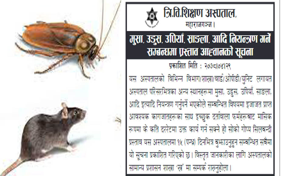 त्रिभुवन शिक्षण अस्पतालमा मुसा र साङ्लाको बिगबिगी भएपछि अस्पतालले ठेकेदारको खोजी गर्दै टेन्डर नै आह्वान गरेको छ । मुसा, साङ्ला, उडुस, उपियाँ मार्न मासिक कति लिने हो खुलाइ गोप्य सिलबन्दी पेस गर्न अस्पतालले टेन्डर आह्वान गरेको हो ।