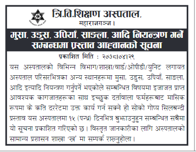 अस्पतालको विभिन्न विभाग, शाखा, वार्ड, ओपिडी र युनिट लगायत अस्पताल परिसरभित्रका अन्य स्थानहरुमा मुसा, साङ्ला, उडुस, उपियाँ मार्न सम्बन्धित विषयमा इजाजत प्राप्त आवश्यक कागजातहरूको पनि माग गरिएको छ ।