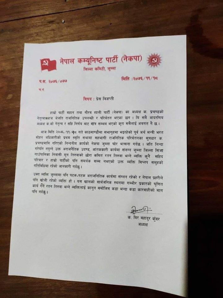 नेकपा जुम्लाका अध्यक्ष बिर बहादुर कुँवरले विज्ञप्ति निकाल्दै तिरुवा शहिद पुत्र नभएको र नेकपाको समर्थक समेत रहेको स्पष्ट पारेका हुन् । उनले जिल्लामा अराजनितिक गतिबिधीमा संलग्न रतन तिरुवा विप्लवको कार्यकर्ता भएको पनि उनले नेकपाको विज्ञप्तिमा लेखिएको छ ।