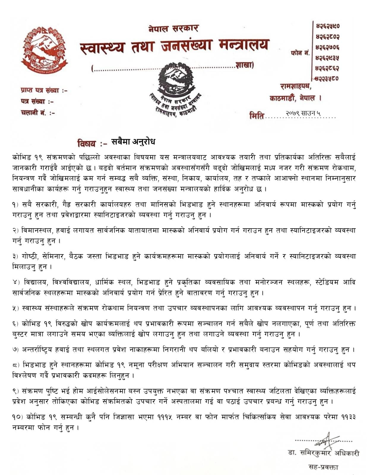 मन्त्रालयले सबै सरकारी तथा गैह्र सरकारी कार्यालयहरु तथा मानिसको भिडभाड हुने स्थानहरुमा अनिवार्य मास्क प्रयोग गर्न तथा गराउन र स्यानिटाइजरको व्यवस्था गर्न अनुरोध गरेको छ ।