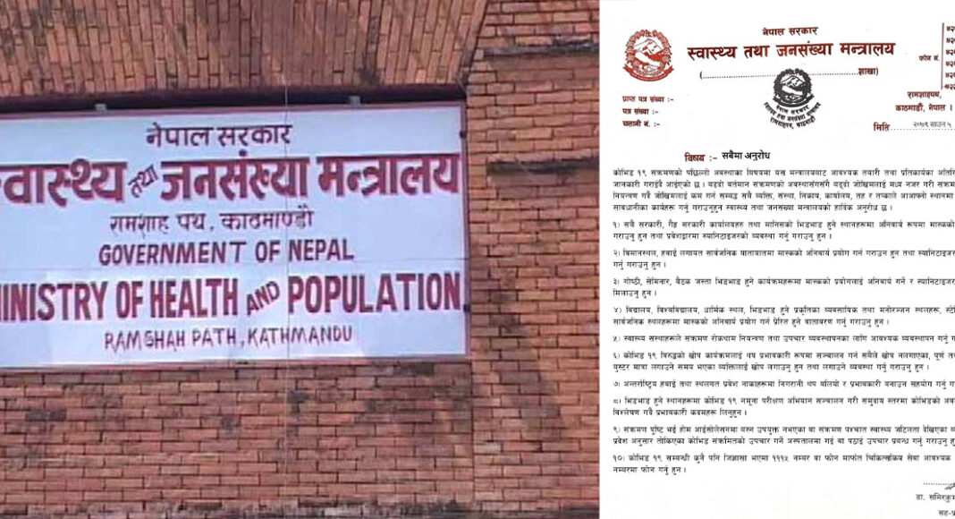 नेपालमा केही सातायता कोरोना संक्रमित हुनेको संख्या दैनिक बढ्न थालेपछि स्वास्थ्य तथा जनसंख्या मन्त्रालयले बिहीबार एक सूचना जारी गर्दै कोरोनाको जोखिम कम गर्नका लागि व्यक्ति, संस्था, निकाय, कार्यालय, तह र तप्काले आ–आफ्नो स्थानमा सावधानी अपनाउन अनुरोध गरेको हो ।