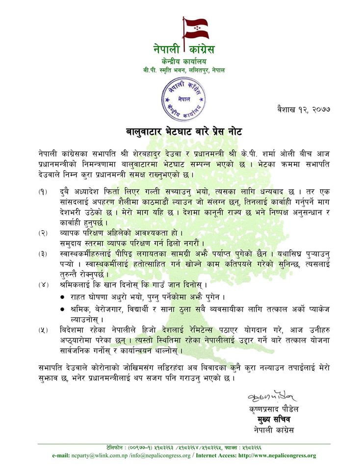 प्रधानमन्त्रीको निमन्त्रणामा बालुवाटार पुगेका देउवाले काेराेना परीक्षणलाई थप व्यापक बनाउन र समुदायस्तरमा परीक्षण गर्न ढिला नगर्न सुझाव दिए। ‘स्वास्थकर्मीहरुलाई पिपिईलगायतका सामग्री अझै पर्याप्त पुगेको छैन। यथासिघ्र पुर्याउनुपर्यो,’ उनले भने, ‘स्वास्थकर्मीलाई हतोत्साहित गर्न खोज्ने काम कतिपयले गरेको सुनिन्छ, त्यसलाई तुरुन्तै रोक्नुपर्छ।’