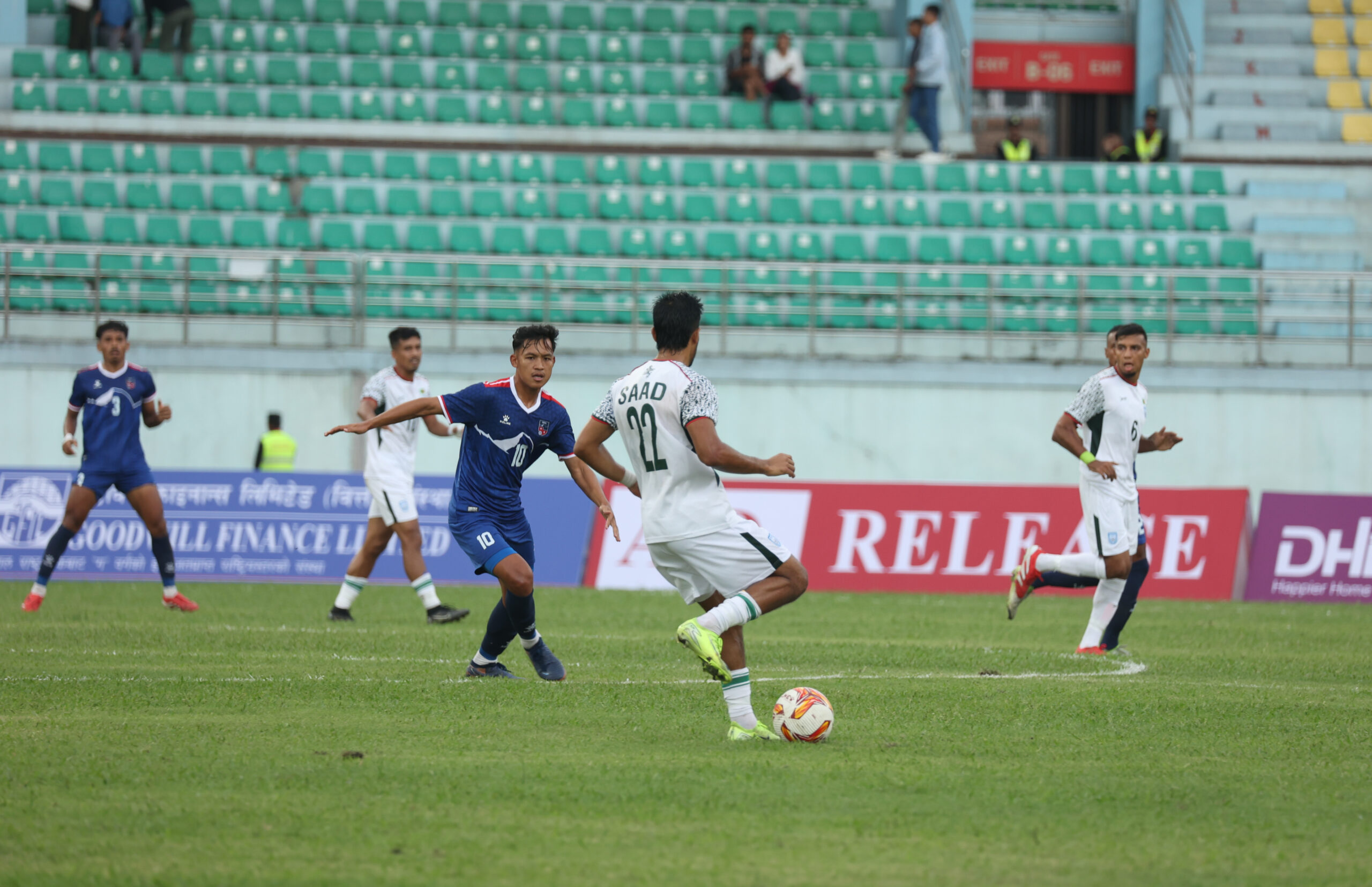 खेलको पहिलो हाफमा दुवै टोलीले आक्रमणका केही अवसर सिर्जना गरे पनि गोल निकाल्न सकेनन्। १० औं मिनेटमा कप्तान जमाल भुयाँको कर्नरमा राकिब होसेनले हेडमार्फत गोलको प्रयास गर्दा नेपाली गोलकिपर किरण चेम्जोङले उत्कृष्ट बचाउ गरे। केही समयपछि मणि लामाको फ्रिकिकमा अनन्त तामाङको हेड पनि बंगलादेशी गोलकिपर मोहम्मद सुजोन होसेनले रोके।