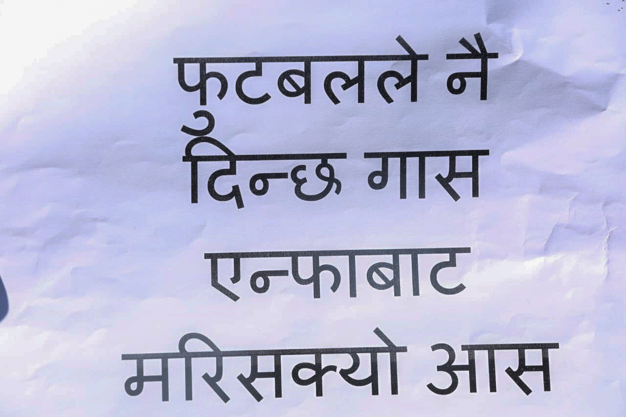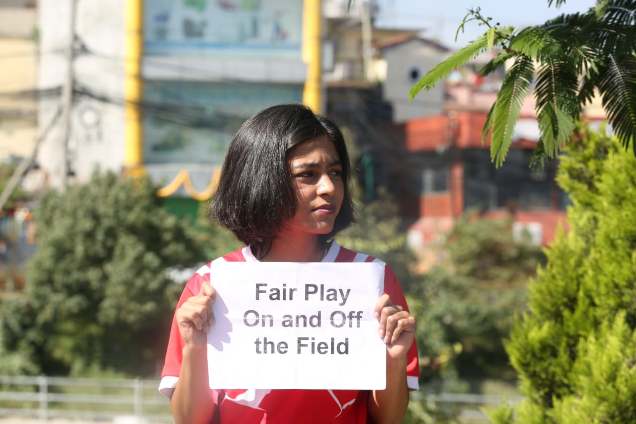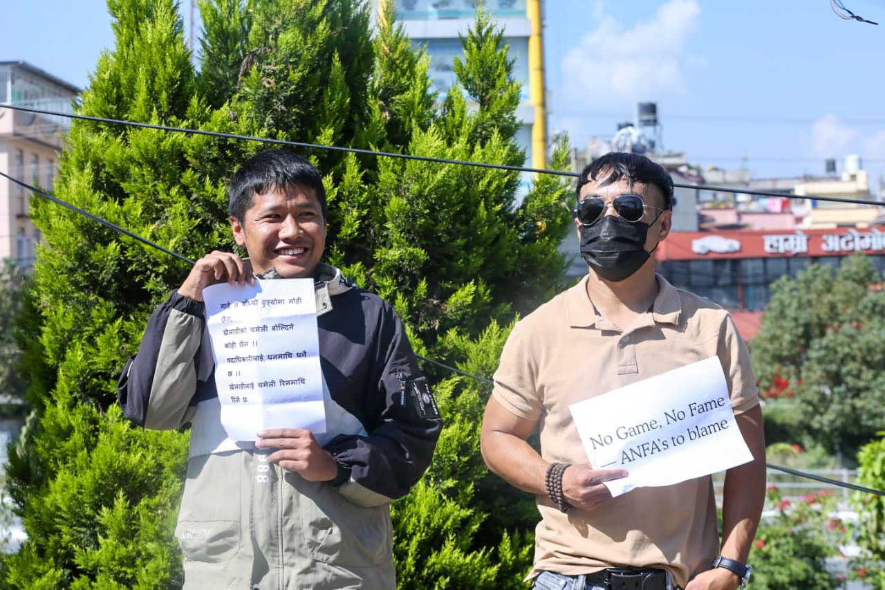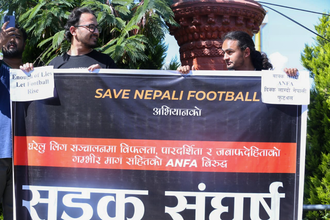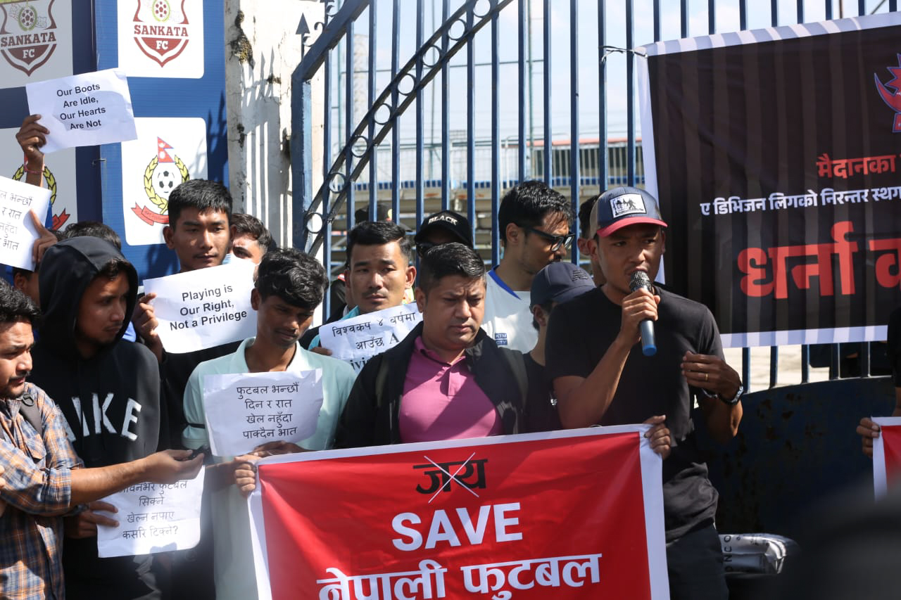 पछिल्लो दुई वर्षयता लगातार नेपाली फुटबलको मेरुदण्ड मानिने शहिद स्मारक ‘ए’ डिभिजन लिग निरन्तर स्थगन भएकाविरुद्ध ललितपुरस्थित एन्फा मुख्यालय अगाडि फुटबल समर्थकहरुले धर्ना दिएका छन् । नेपाल फुटबल खेलाडी संघको आयोजनामा सेभ नेपाल फुटबल अभियान संचालन गरिएको हो । तस्बिरहरु : सक्षम घिमिरे, नेपाल न्यूज बैंक