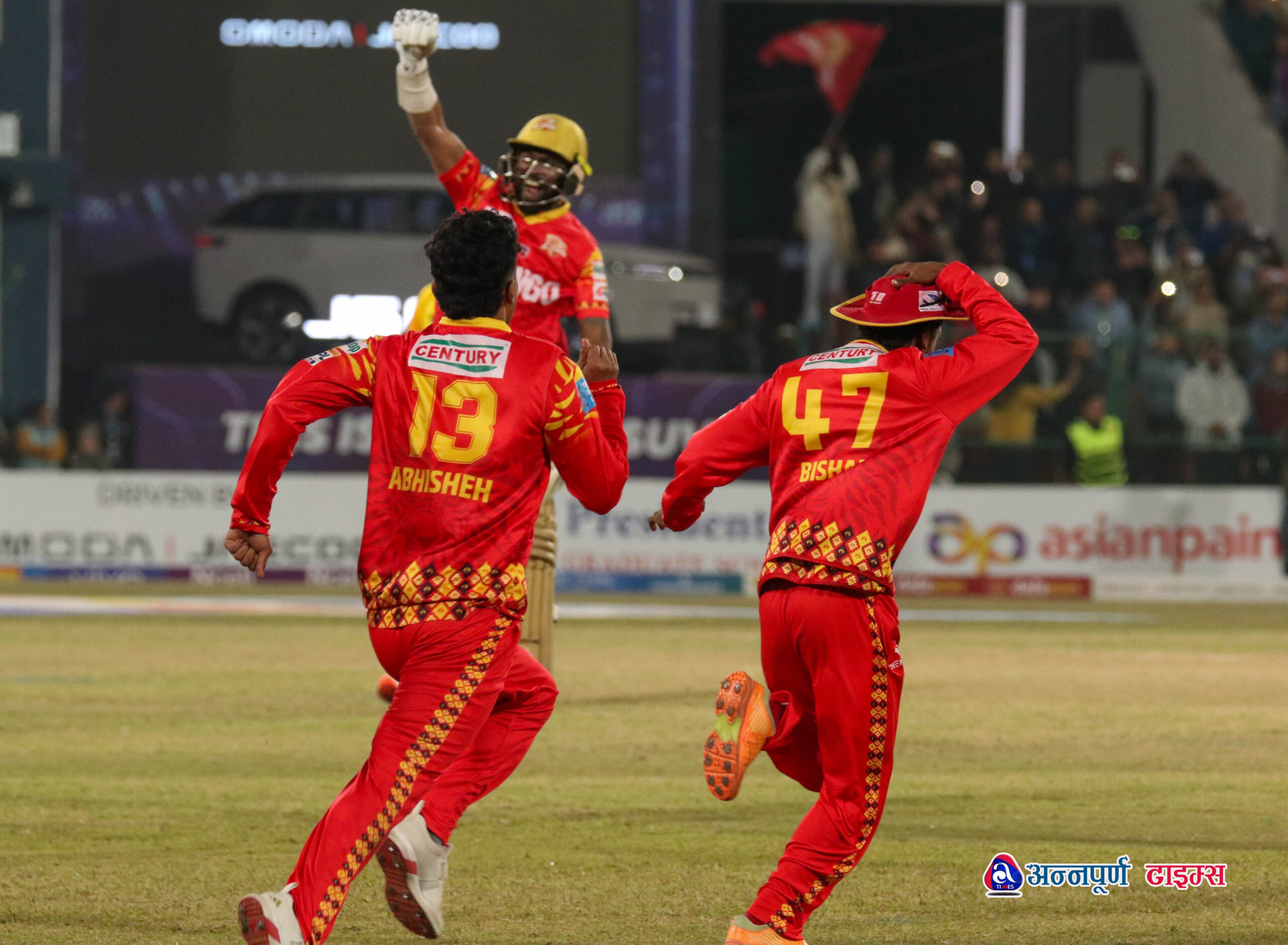 यस्तै, कप्तान दिपेन्द्रसिंह ऐरीले १३ रन बनाए भने हरमीत सिंह र स्कट कुगेलिइनले समान १०÷ १० रन जोड्न सके । त्यसबाहेक अन्य ब्याट्सम्यानहरूले दोहिरो अङ्कमा रन जोड्न सकेनन् । लुम्बिनी लायन्सका बलरहरूले उत्कृष्ट प्रदर्शन गरे । उसका लागि शेर मल्ल, रुबेन ट्रम्पेलमान र कप्तान रोहितकुमार पौडेलले समान तीन÷तीन विकेट हात पारे । यस्तै, तिलक भन्डारीले एक विकेट लिए ।
