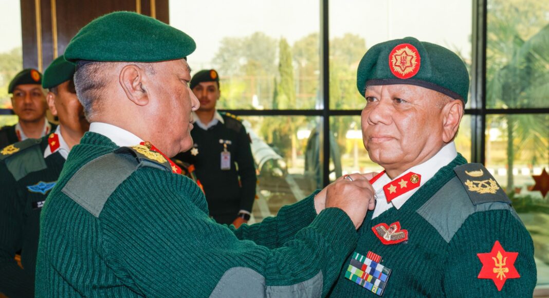 काठमाडौं — नेपाली सेनाका प्रधान सेनापति अशोक राज सिग्देलले उपरथी दर्जामा पदोन्नति हुनुभएका अधिकृतहरूलाई दर्ज्यानी चिन्ह प्रदान गर्नुभएको छ।