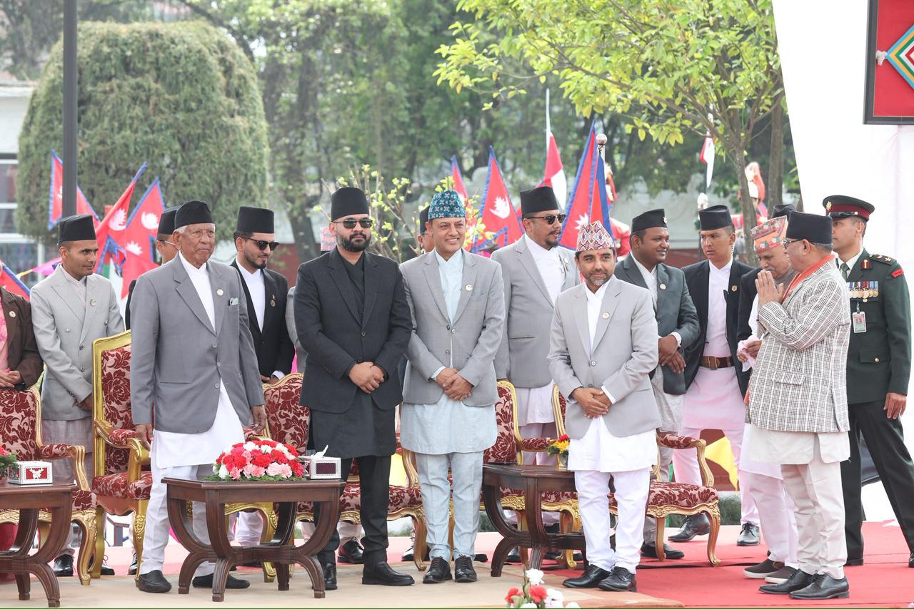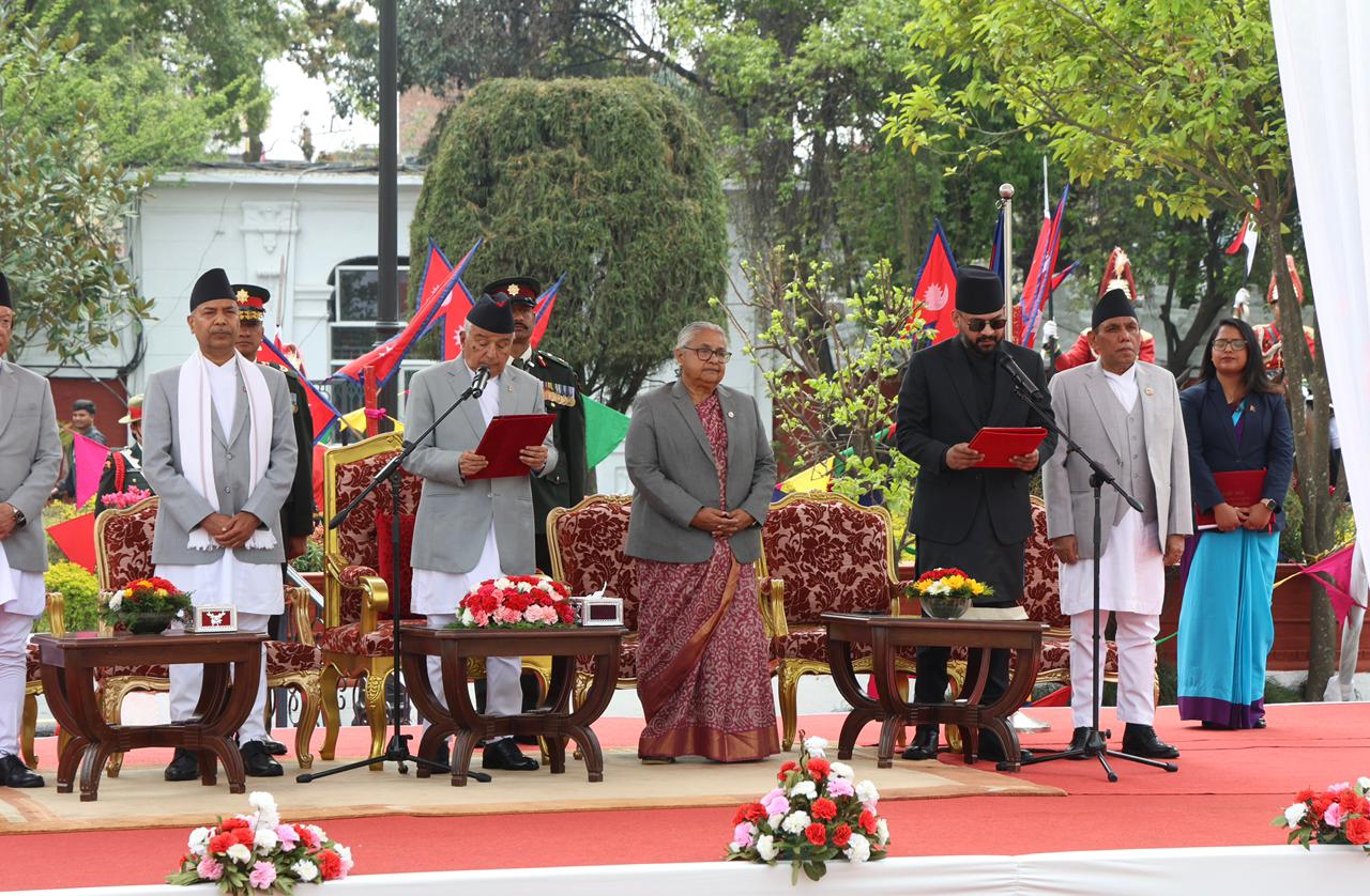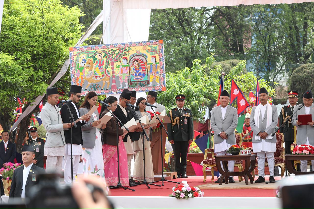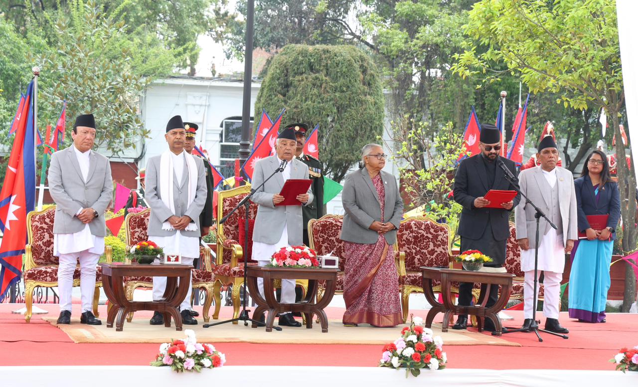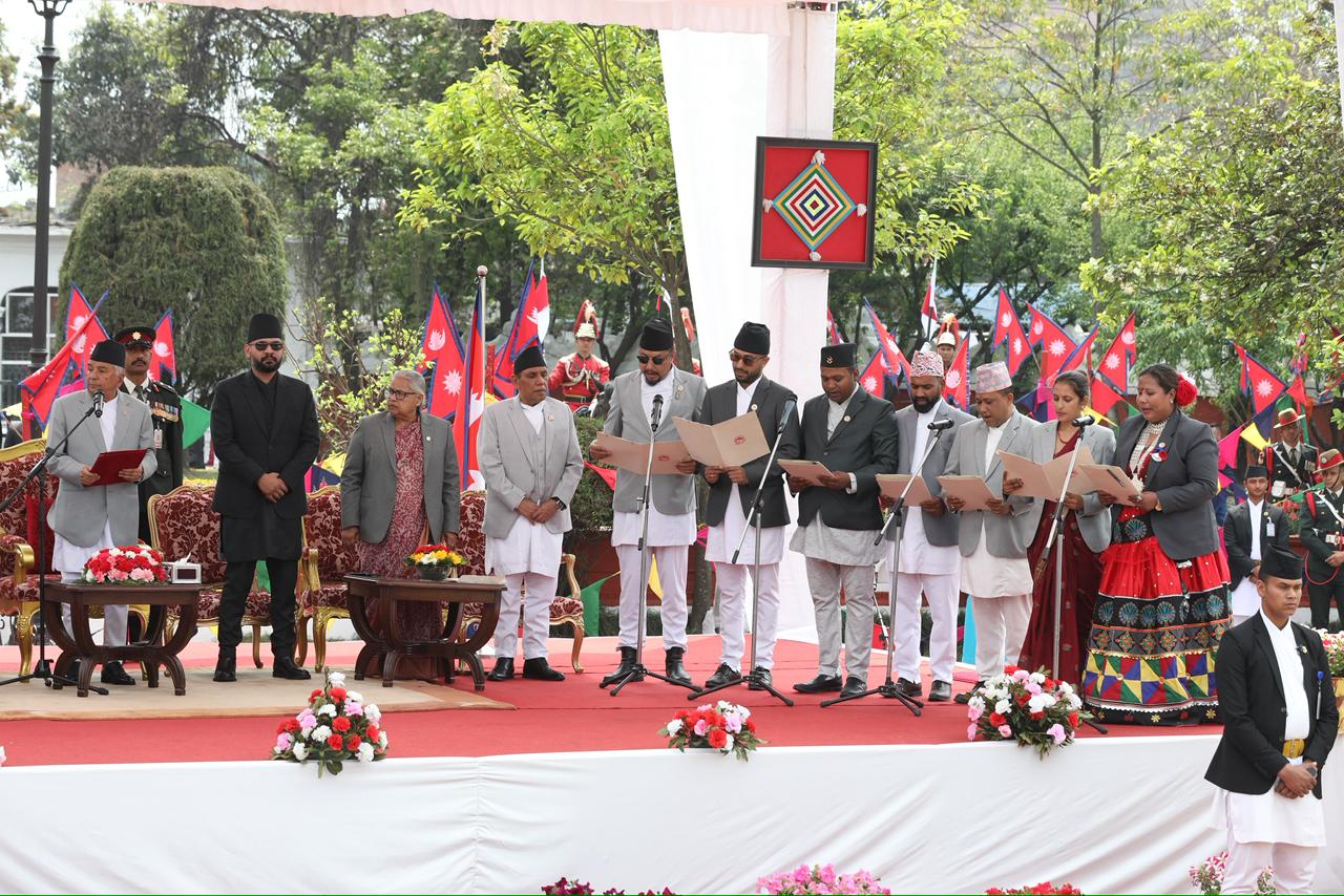 नवनियुक्त प्रधानमन्त्री बालेन शाहसहित मन्त्रीहरुले पद तथा गोपनीयताको शपथ लिएका छन् । शुक्रबार राष्ट्रपति रामचन्द्र पौडेलबाट उनीहरुले पद तथा गोपनीयताको शपथ लिएका हुन् । शपथ ग्रहण समारोहमा १०८ जना बटुकले स्वस्तिक वाचन, १०७ बौद्ध लामा गुरुहरूले मंगल वाचन र सात जना ब्राह्मणले शंखनाद गरेका थिए । तस्बिर : सक्षम घिमिरे/ नेपाल न्यूज बैंक