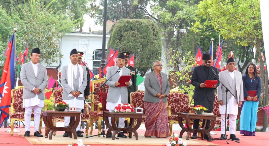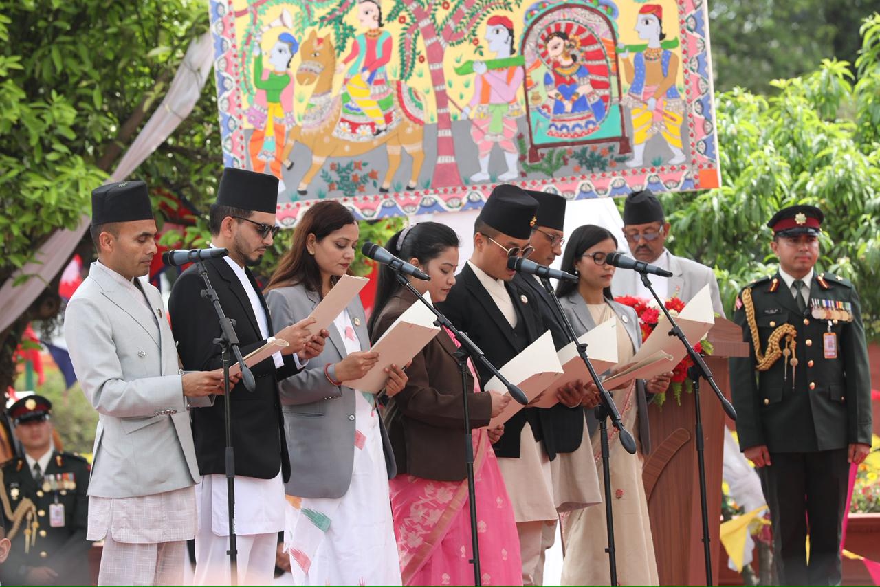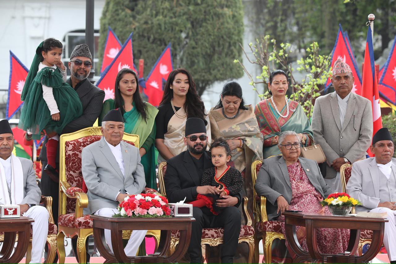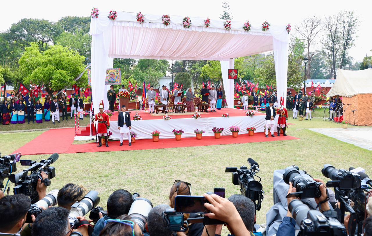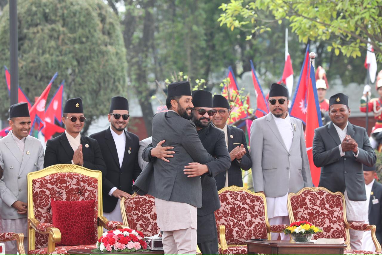 नवनियुक्त प्रधानमन्त्री बालेन शाहसहित मन्त्रीहरुले पद तथा गोपनीयताको शपथ लिएका छन् । शुक्रबार राष्ट्रपति रामचन्द्र पौडेलबाट उनीहरुले पद तथा गोपनीयताको शपथ लिएका हुन् । शपथ ग्रहण समारोहमा १०८ जना बटुकले स्वस्तिक वाचन, १०७ बौद्ध लामा गुरुहरूले मंगल वाचन र सात जना ब्राह्मणले शंखनाद गरेका थिए । तस्बिर : सक्षम घिमिरे/ नेपाल न्यूज बैंक