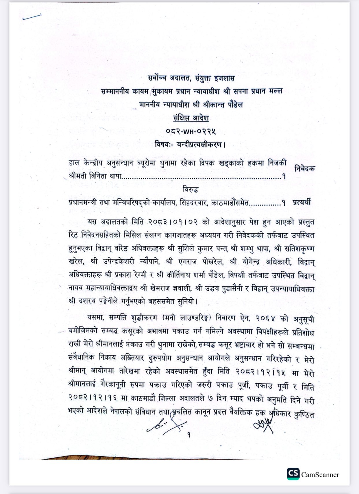 खड्काको पक्राउ र म्याद थप कानुनसम्मत नदेखिएको भन्दै कामु प्रधानन्यायाधीश सपना प्रधान मल्ल र न्यायाधीश श्रीकान्त पौडेलको संयुक्त इजलासले खड्कालाई थुनामुक्त गर्न भनेको हो।