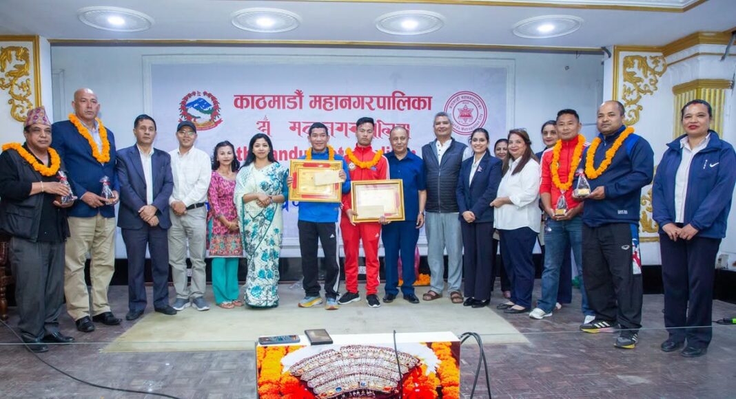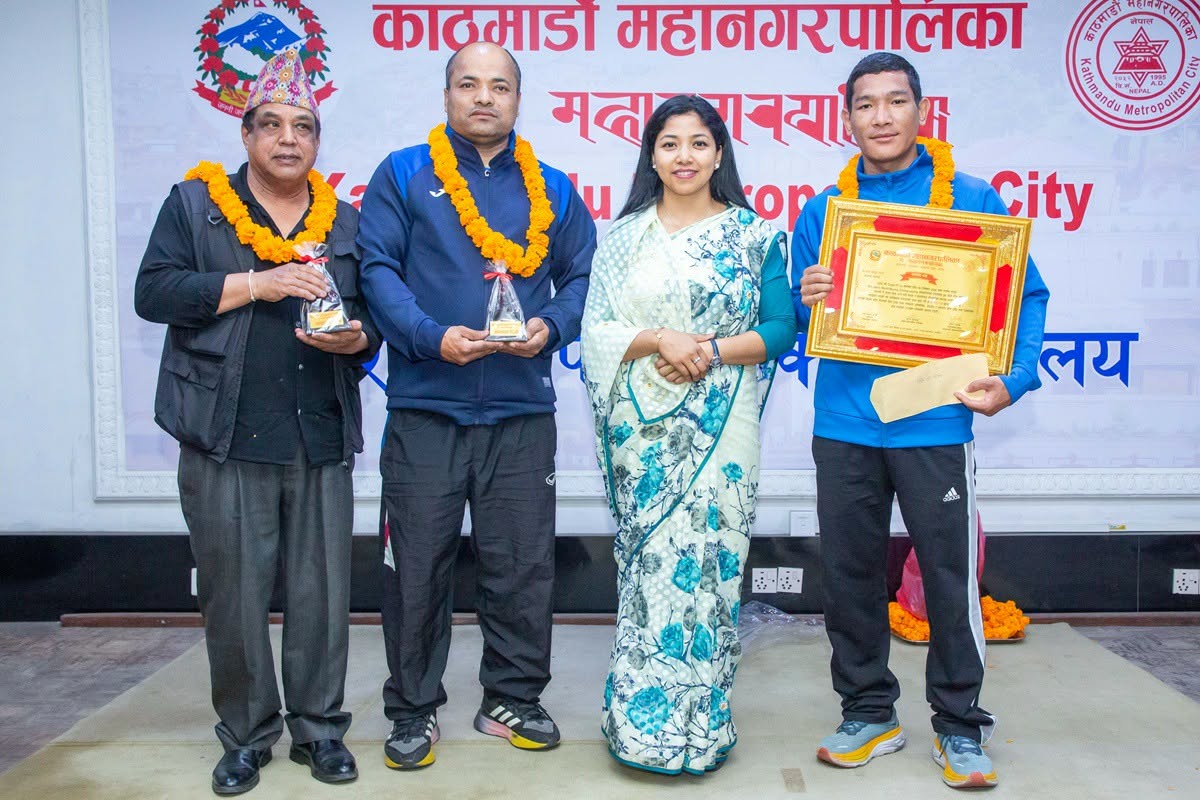काठमाडौँ – काठमाडौँ महानगरपालिकाले अन्तर्राष्ट्रिय खेल प्रतियोगिताका पदक विजेता २ जना खेलाडीलाई नगदसहित सम्मान गरेको छ । आज काठमाडौँ प्लाजामा आयोजना गरिएको एक कार्यक्रममा कार्यवाहक प्रमुख सुनिता डंगोल, प्रवक्ता नविन मानन्धर, सामाजिक समितिका संयोजक रामकुमार के. सी. र प्रमुख प्रशासकीय अधिकृत सरोज गुरागाईँले उहाँहरुलाई सम्मान गर्नुभएको हो । खेलकुदमार्फत राष्ट्रिय पहिचान अभिवृद्धिमा योगदान पुर्याए वापत उहाँहरुलाई सम्मानित गरिएको हो ।